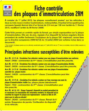 La hauteur des lettres de chiffres sera de 5 millimètres avec une tolérance de 10 %. La marque d’homologation, nettement visible, sera reproduite d’une manière indélébile sur le matériau réflectorisé en haut et à moins de 40 millimètres du bord latéral gauche de la plaque.